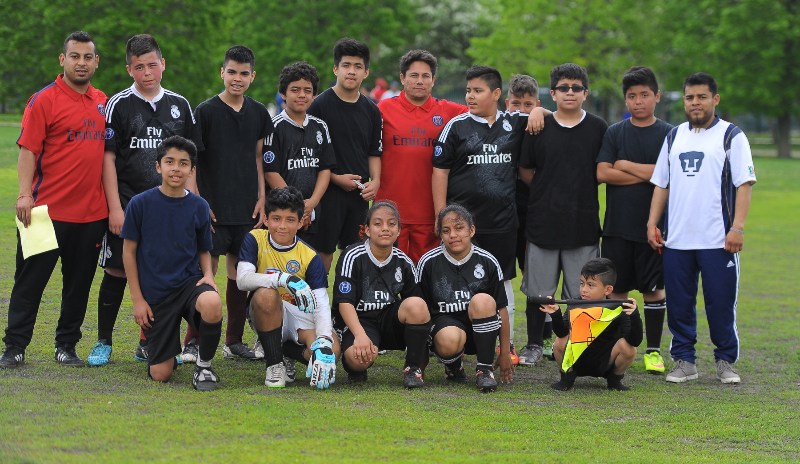 Las gemelas Cindy y Cathy Correa son las únicas mujeres en el equipo Galaxy U12, dirigido por Pedro Correa (derecha), el padre de las niñas. Crédito: Javier Quiroz | La Raza