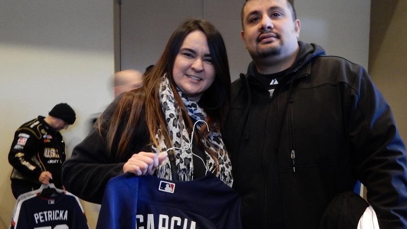 Misael y Nelly García con sus regalos de Navidad del garage sale de los White Sox. Crédito: Javier Quiroz | La Raza