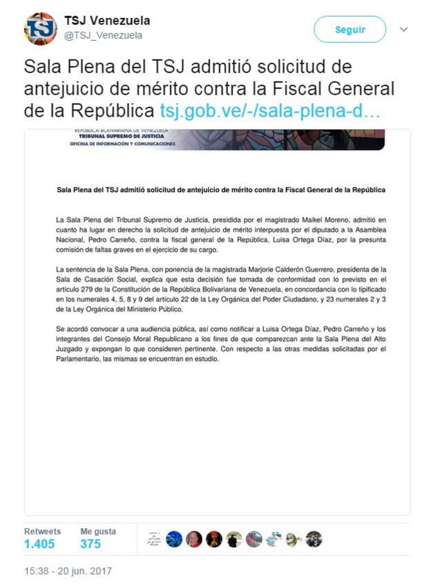 El pleno de la máxima corte venezolana admitió una solicitud introducida por un diputado oficialista que pide enjuiciar a la fiscal general, Luisa Ortega Díaz