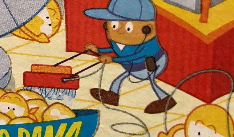 El dibujo en cuestión es una representación aparentemente inocente de un trabajador de limpieza el cual está tristemente haciendo su trabajo mientras todos a su alrededor jugando.