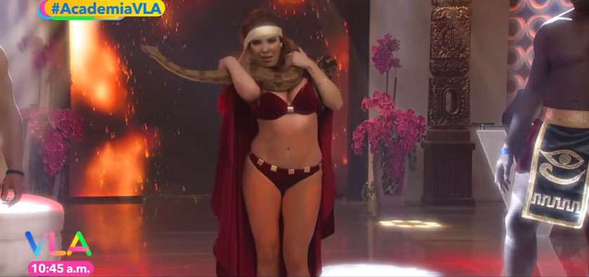 Con 30 años, la también cantante estuvo el fin de semana anterior en el programa mexicano Venga la Alegría, donde se desarrolla un concurso de famosos llamado La Academia VLA. Durante su intervención interpretó el éxito noventero de Thalía, Amor a la Mexicana, ataviada con un sensual disfraz y cargando a una inquieta serpiente.