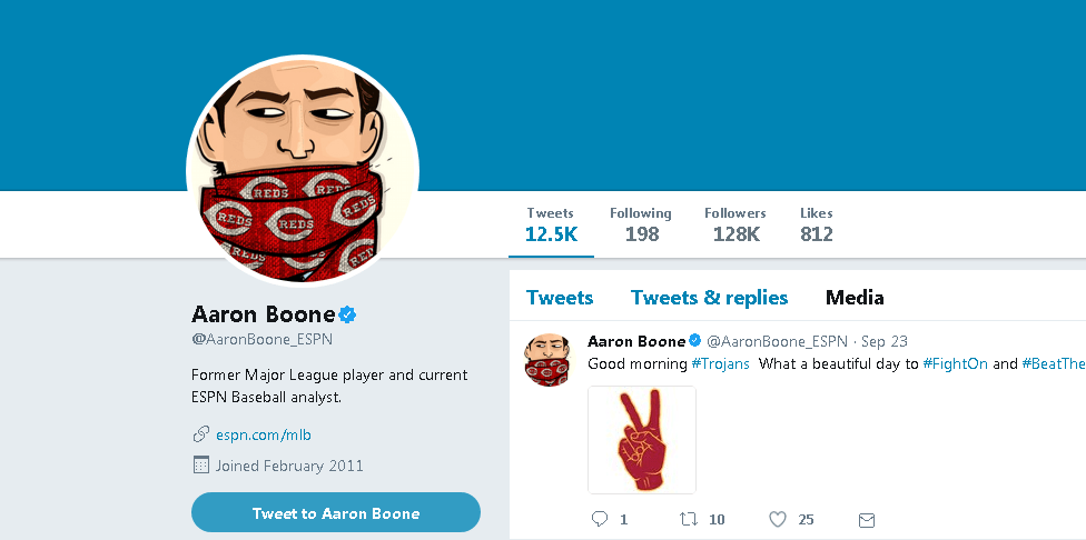 La cuenta oficial de Twitter del nuevo piloto de los Yankees muestra su afición por los Rojos de Cincinnati y los Trojans de USC. Crédito: Twitter Aaron Boone