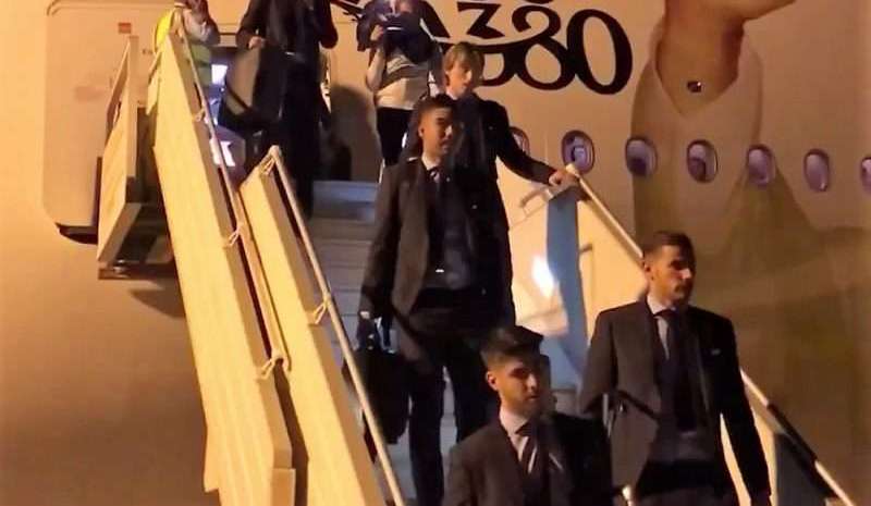 Integrantes el Real Madrid bajan del avión tras aterrizar en Abu Dhabi. Crédito: Especial | Tomada de la TV