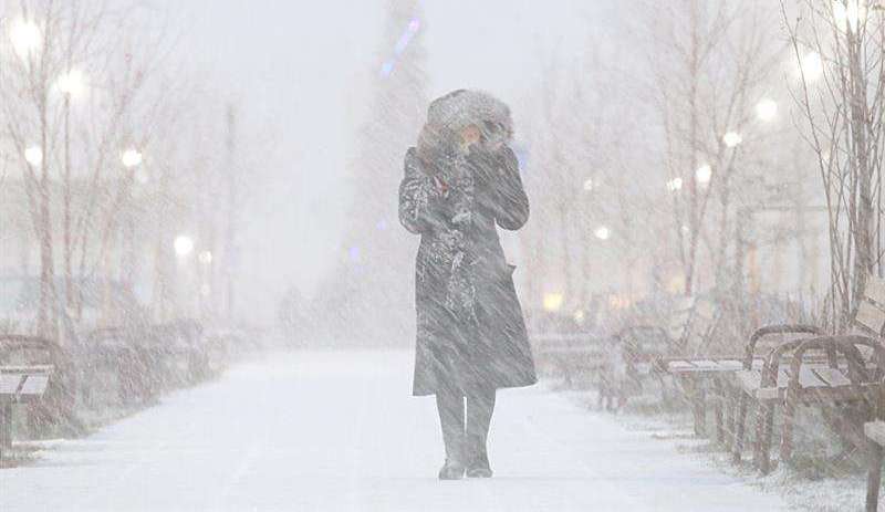 Una mujer camina por la calle durante una tormenta de nieve en Rusia/ EFE Crédito: EFE
