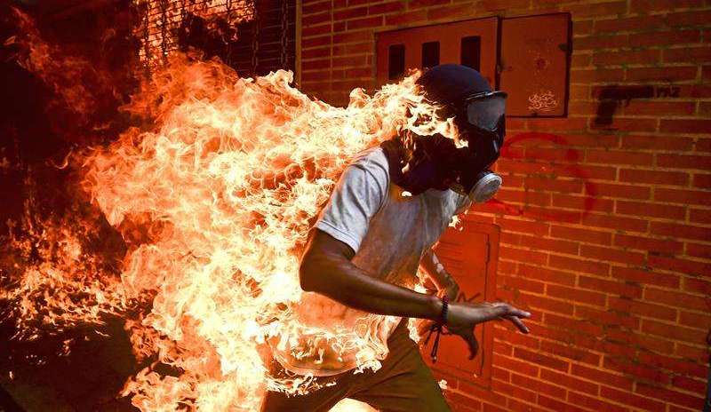 La instantánea recoge el momento en el que José Víctor Salazar, de 28 años, sale corriendo envuelto en llamas al ser alcanzado por un chorro de gasolina proveniente de una moto de la Guardia Nacional Bolivariana, que fue capturada e incendiada por manifestantes con un cóctel molotov.