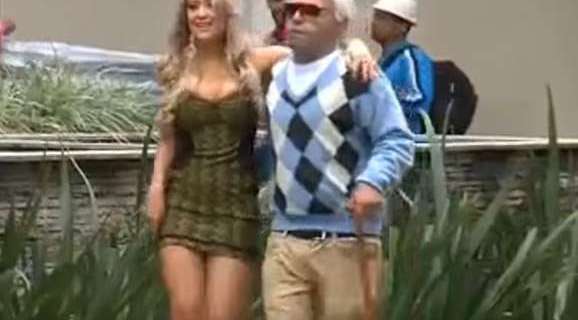 La escena es la siguiente: un supuesto anciano camina agarrado del brazo de una voluptuosa joven de pelo rubio por una calle concurrida. En momentos se detienen para besarse y abrazarse.