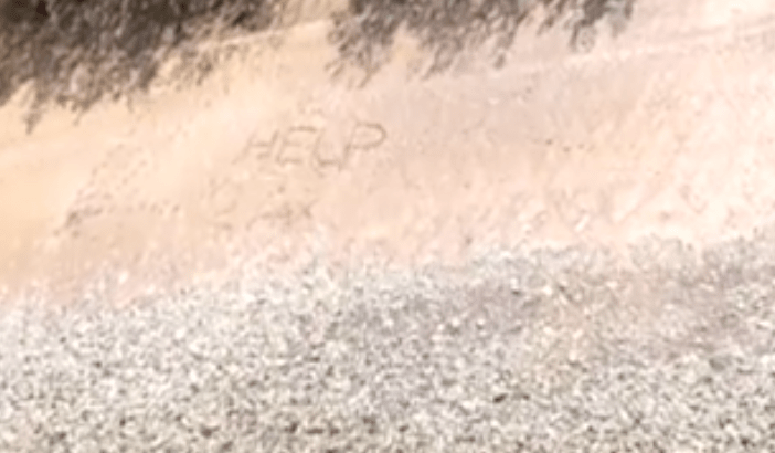 Mensaje de ayuda escrito por una pareja perdida en una isla. Crédito: Screenshot/abc news