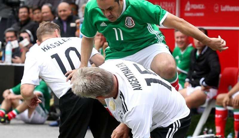 Cuauhtémoc Blanco hizo la 'cuauhtemiña' durante el partido de leyendas del Tri y Alemania en el Zócalo de la CDMX. Crédito: José Luis Ramírez | Agencia Reforma