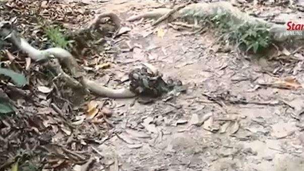 Unos turistas se encontraban de viaje en Pengang, Malasia, cuando de repente fueron testigos de una pelea monumental entre una cobra y un pitón.