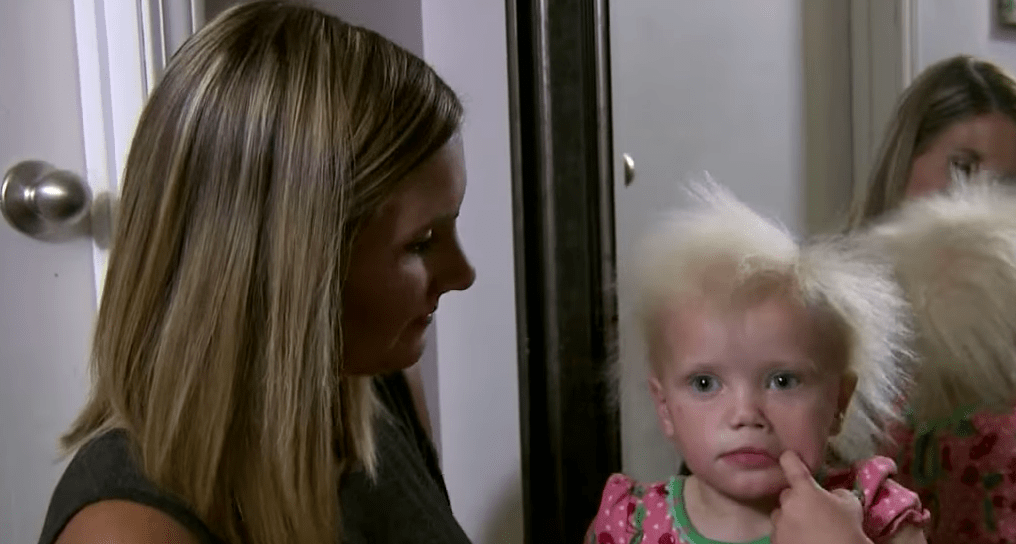 Una madre intenta peinar el cabello de su hija con el síndrome del cabello impeinable. Crédito: Screenshot Inside Edition.