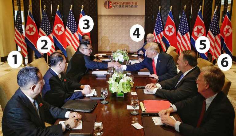 Aquí te contamos quién es quién en la foto del primer encuentro en la historia entre los líderes de Washington y Pyongyang.