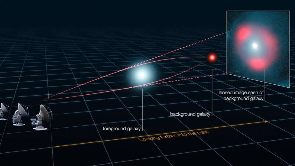 La luz de galaxias distantes se distorsiona por el efecto gravitatorio de una galaxia más cercana a nosotros. Ésta última actúa como una lente y hace que la fuente alejada aparezca distorsionada, pero más brillante, formando anillos de luz llamados anillos de Einstein, según explicó ESO. Crédito: ALMA (ESO/NRAO/NAOJ), L. Calçada (ESO), Y. Hezaveh