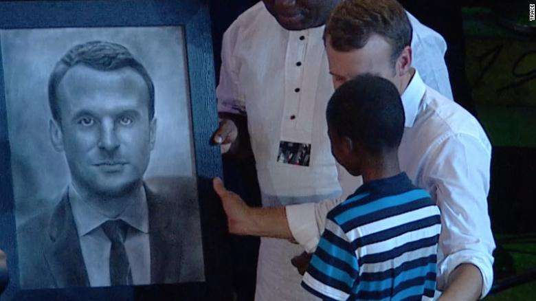 Un Macron visiblemente conmovido tocó la cabeza con Olamilekan y luego lo publicó en Twitter para apreciar su trabajo.