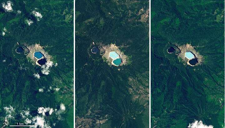 Las imágenes al inicio fueron adquiridas por Operational Land Imager en Landsat 8, muestran los diferentes colores de los lagos del cráter en tres días diferentes. Los tres lagos de cráter aparecen en la cresta del volcán y los dos lagos orientales comparten una pared de cráter común.