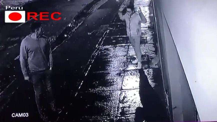 Resulta ser que una cámara de seguridad captó el momento en que un chico está revisando su teléfono celular en la puerta de una casa, en la capital Lima, a altas horas de la madrugada, cuando de repente, escuchó pasos cerca de él, gracias a que había charcos en la calle.