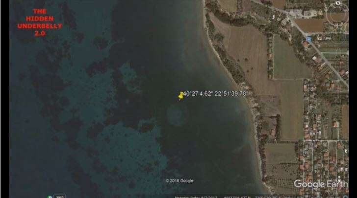 En la imagen tomada por Google Earth se alcanza a ver claramente un gran objeto circular, con otros círculos más pequeños que van hacia el centro de este. Dicho objeto se localiza a pocos metros de las costas de Michanonia, en Thessaloniki.