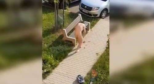 El clip inicia con el sujeto desnudo corriendo por la entrada de lo que parece ser un complejo de vivienda.