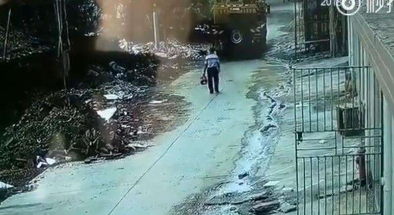 Una cámara de seguridad ubicada en una de las calles en China captó el momento justo en que un hombre ciego es atropellado por un gran camión.