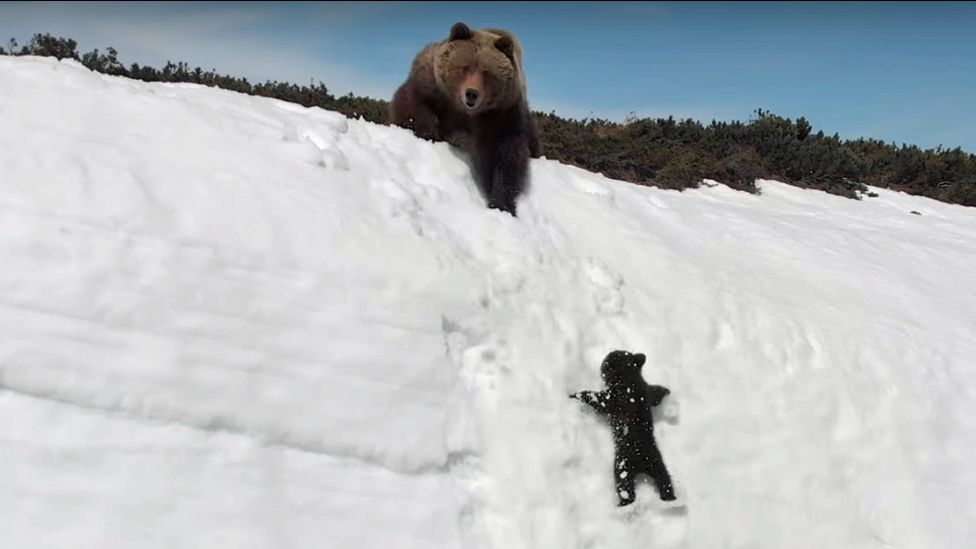 El osito intenta valientemente seguirle el paso a su madre, enterrando sus garras en la nieve, sólo para deslizarse decenas de metros abajo.