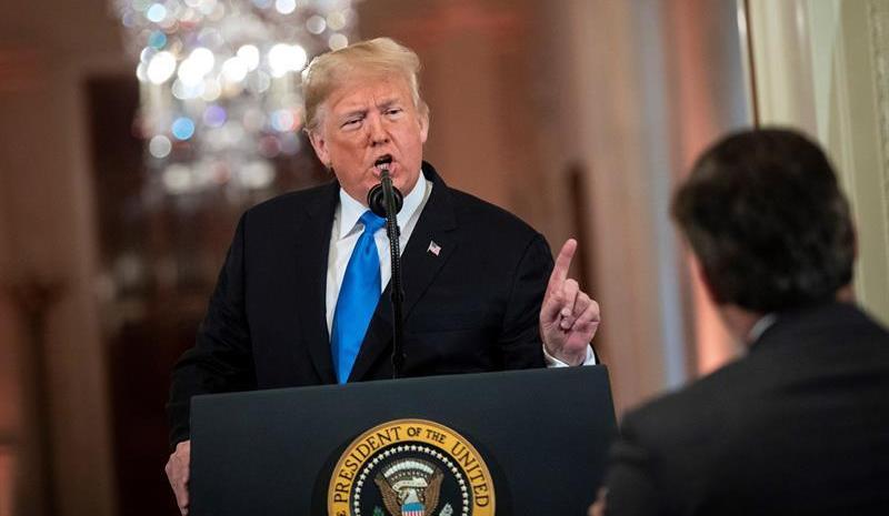 Trump se enfrentó al corresponsal Jim Acosta en la rueda de prensa sobre los resultados de las elecciones. Crédito: Al Drago / Pool | Efe