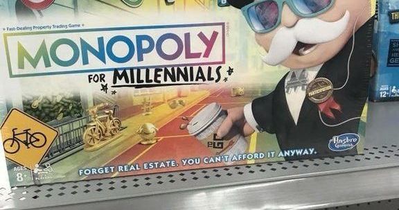 Es que en el Monopoly for Millenials, de Hasbro Gaming, en vez de conseguir dinero, gana el que más experiencias haya acumulado. Pero lo que despertó críticas es la manera en que invita a jugar: “Forget real estate, you can’t afford it anyway” (“Olvídate de los bienes raíces, de todas formas no puedes pagarlo”) dice la parte inferior de la carátula del juego.