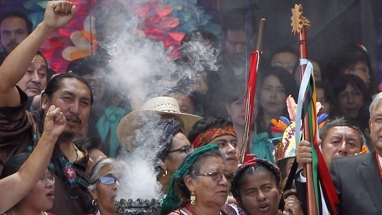 También habló a los indígenas que acudieron para entregarle el bastón de mando, para los tarahumaras, nahuales, mayas, mixtecos, afromexicanos, tzotziles, y 68 pueblos más que bailaron en una tarima especial antes de lanzarle humo de copal y pasarle yerbas por todo el cuerpo en un ritual de purificación, para que “todos sus deseos se hagan realidad” y “darle sabiduría”. Para quienes hicieron “la limpia” y para que todos los males se vayan.