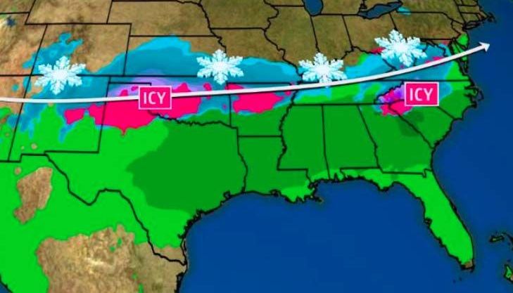 El sistema llegaría el sábado a Tennessee, el norte de Georgia y el norte de South Carolina. Se teme nieve y congelamiento en las vías en esas regiones.
