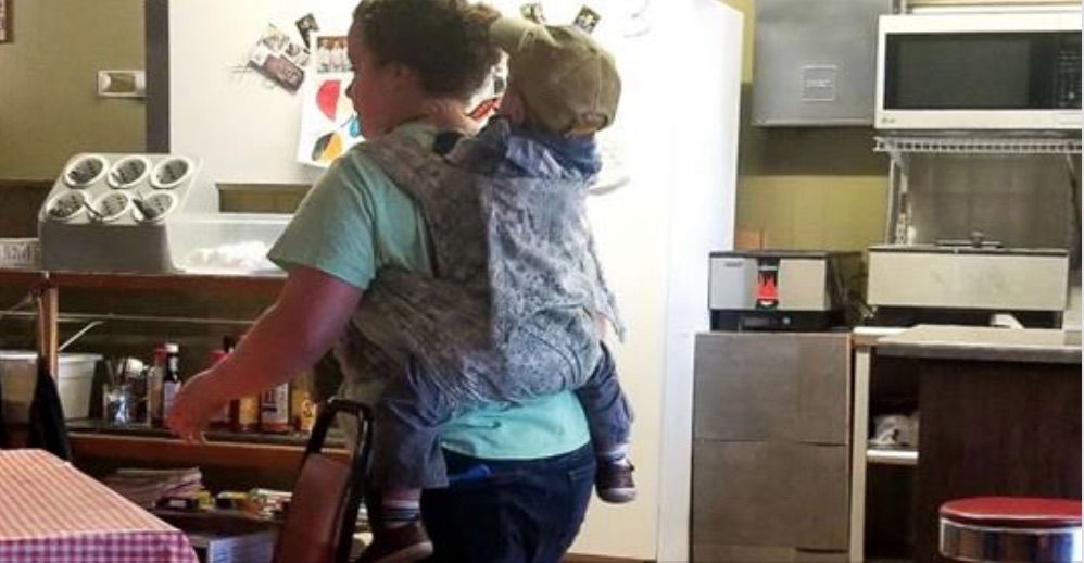 Kori Dotson, lo tuvo claro. Se fue al trabajo con su hijo, al que ató a sus espalda y cumplió con su turno en el restaurante.