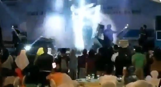 En las imágenes se observa cómo los fans disfrutaban al máximo al ritmo de la música del grupo indoneso, cuando de repente se la ola que impacta en el escenario, arrastrando a los músicos y enseguida a los fans que comienzan a gritar.