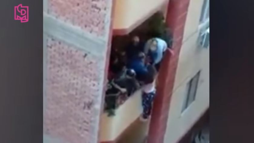 Por fortuna, gente del edificio se percató que la mujer colgaba desde el balcón. Crédito: YouTube