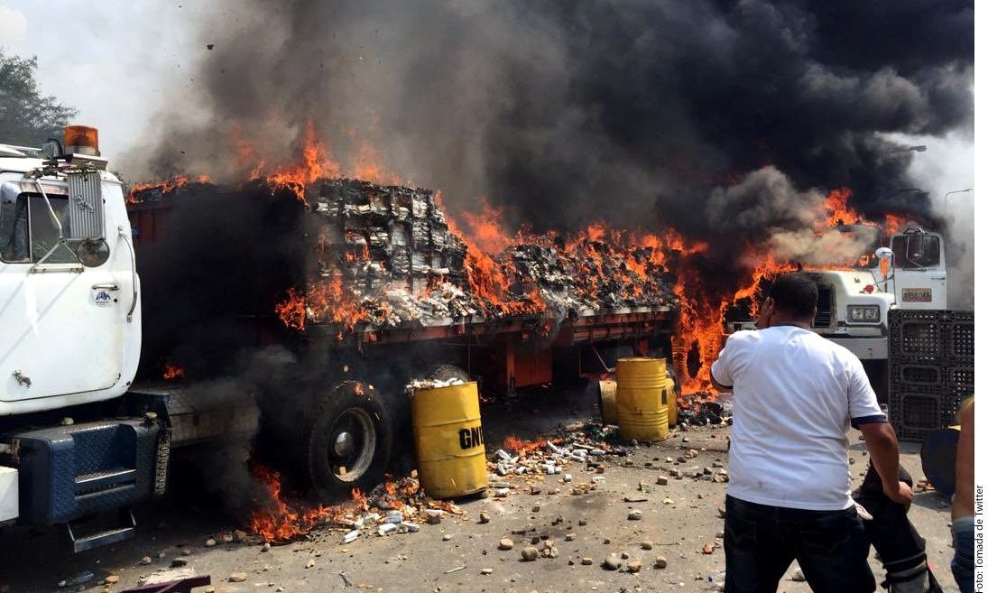 Camiones que transportaban ayuda para Venezuela fueron incendiados. Crédito: Agencia Reforma