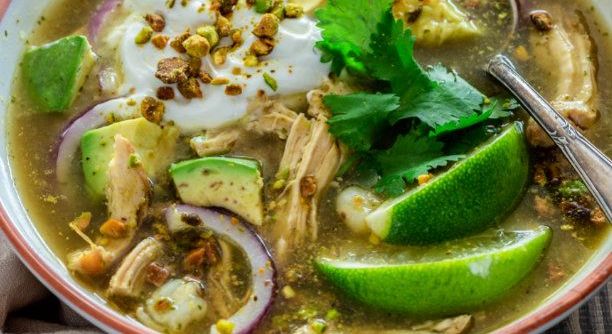 Pozole de Pollo con Pistachios Triturados