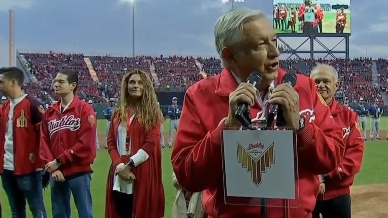 El mandatario iba vestido con la chamarra de los Diablos Rojos del México y acompañado de Alfredo Harp Helú, dueño de la franquicia y anfitrión del nuevo estadio en la capital mexicana.