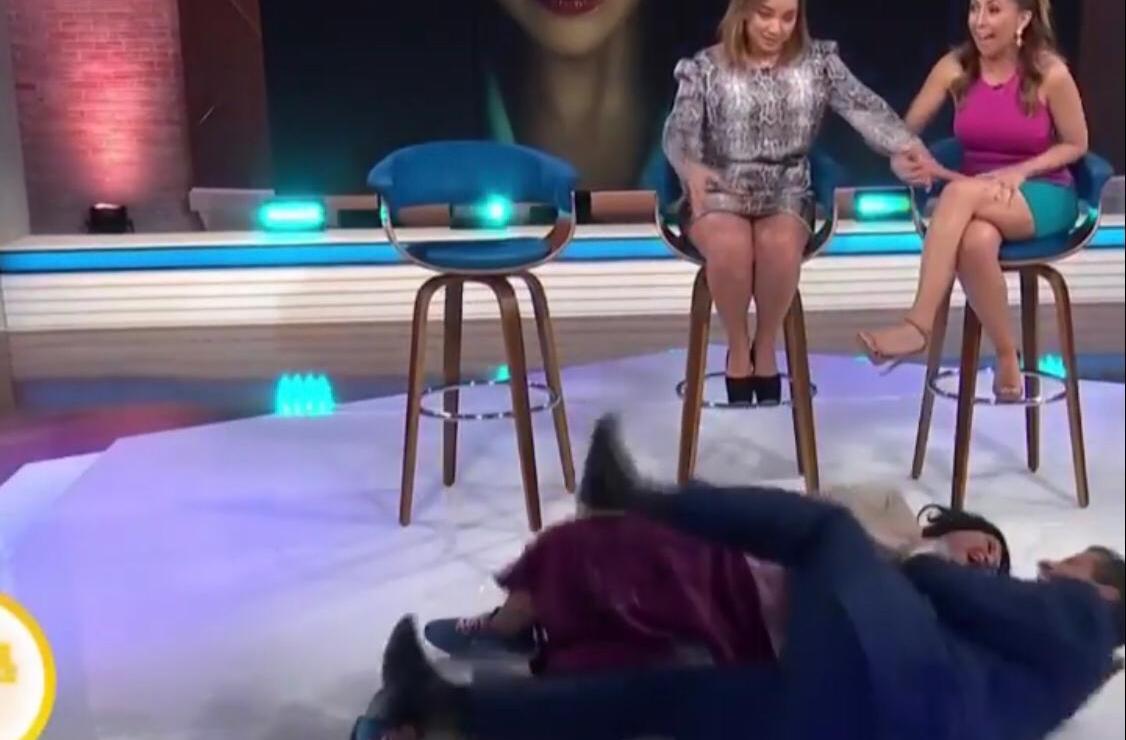 El baile empezó tranquilo, con pasos seguros, pero la situación se descontroló cuándo Regil hizo un mal movimiento que los llevó al piso. Entre risas el conductor no se pudo levantar, y La Chupitos aprovechó la ocasión para tirarse encima del famoso conductor de televisión.