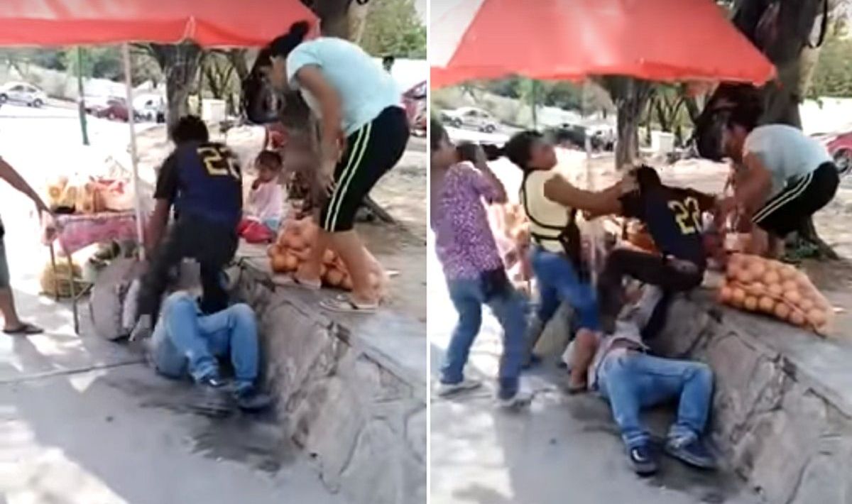 La esposa del hombre intenta ayudarlo, pero es jalada del cabello por otra hondureña, quien la tira al suelo.