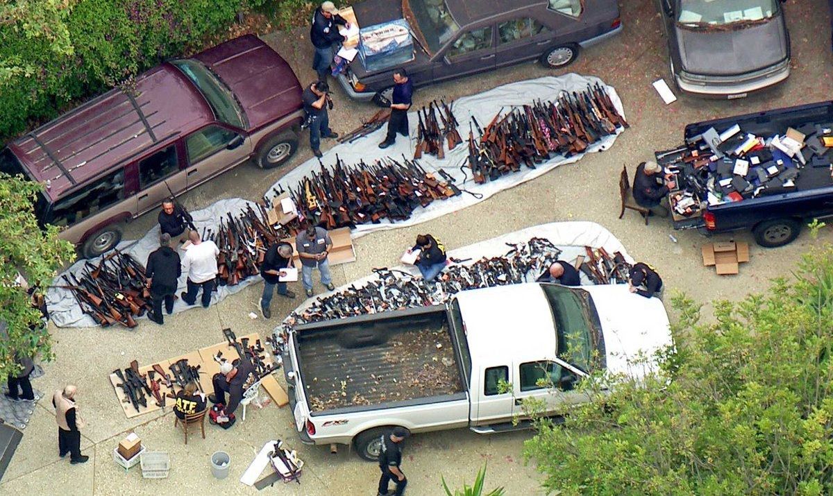 La pista anónima llevó a funcionarios de la Oficina de Alcohol, Tabaco, Armas de Fuego y Explosivos y oficiales del Departamento de Policía de Los Ángeles a presentar una orden de allanamiento a las 4 a.m. en la mansión ubicada en el bloque 100 del Bulevar Beverly Glen donde las autoridades encontraron miles de revólveres, pistolas, rifles y escopetas de diversos calibres y tamaños.