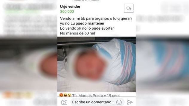 “Vendo a mi bebe para órganos o lo que quieran yo no la puedo mantener, lo vendo porque no pude abortar, no menos de 60 mil pesos”, escribió presuntamente la desnaturalizada madre.