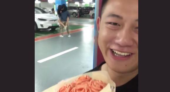 En el video se puede ver a Ken con un bello ramo de rosas color salmón y detrás de él a una joven que abraza efusivamente a otro chico. Entonces Wong comenta que esa chica es su novia y fue así como se enteró de que esta le era infiel.