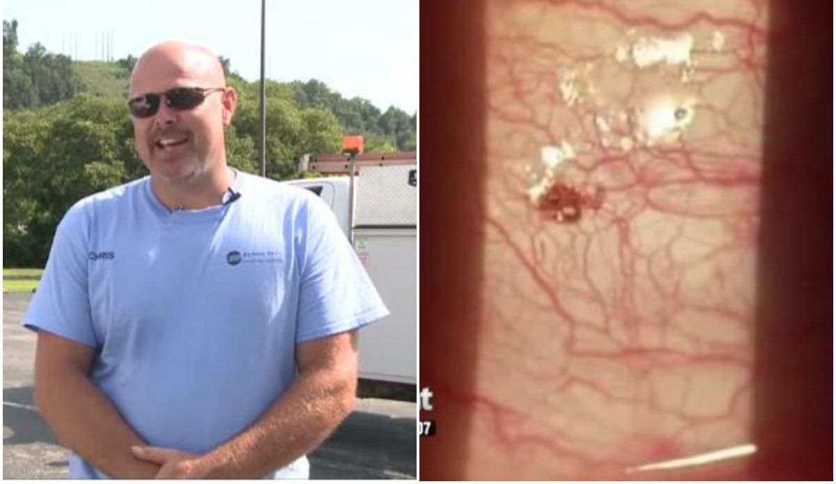 Resulta ser que Chris trabaja para una compañía eléctrica y dejó su equipo de trabajo recargado en un árbol mientras instalaba algunas líneas eléctricas, por lo que seguramente la garrapata se alojó en algo de los utensilios y posteriormente, saltó al ojo.