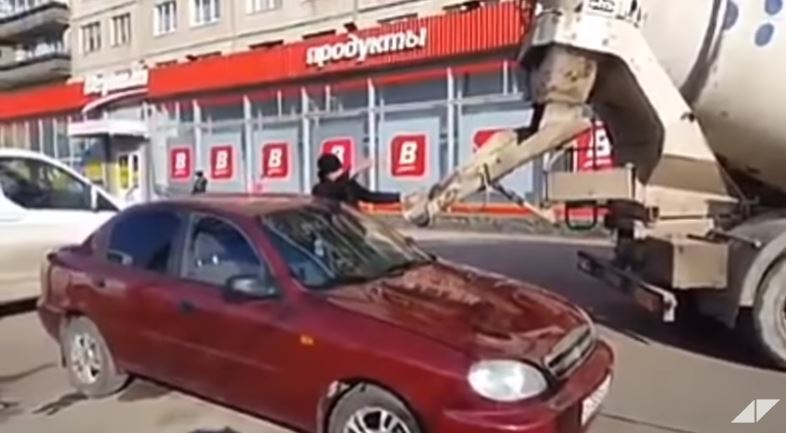 En el video se puede ver a un joven llegando junto con un camión revolvedor de concreto. El hombre se acerca a un auto de color vino, baja la ventanilla de este y posteriormente, le pide al chofer del camión que vacíe todo el contenido dentro del vehículo.