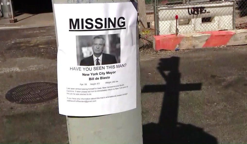 Fue “Visto por última vez avergonzándose a sí mismo en Iowa, New Hampshire y Carolina del Sur”, dicen los carteles en blanco y negro. “Si lo ven, díganle que regrese de inmediato a Nueva York y haga el trabajo para el que fue elegido”.