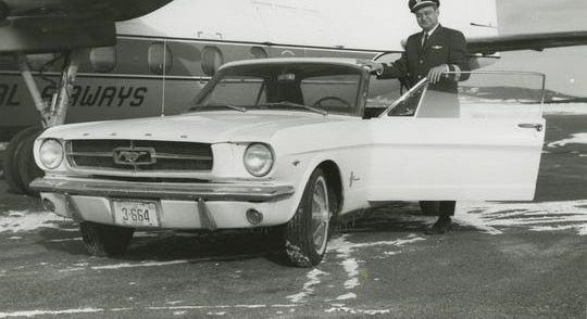 El Capitan Stanley Tucker, piloto canadiense, posa junto al primer Mustang en ser creado, el cual se le vendió por error Crédito: Collections of the Henry Ford