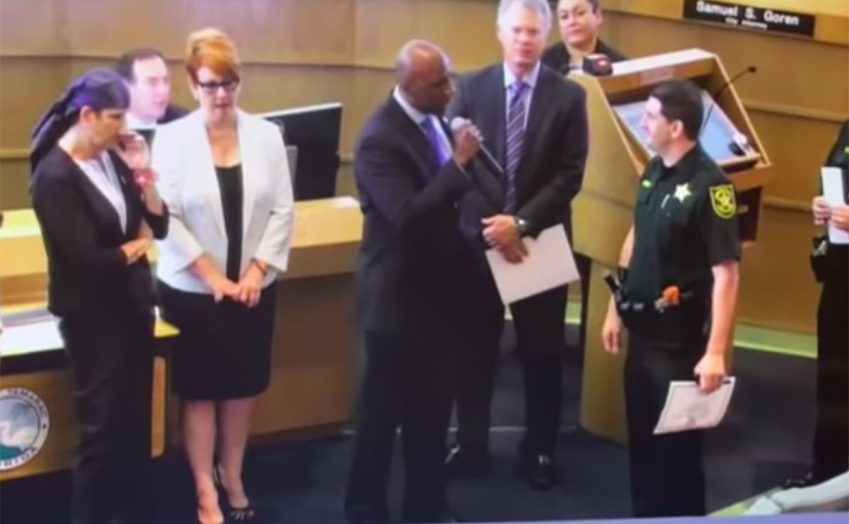 Un concejal de Tamarac, Florida, se guardó un momento especial en la carrera de un policía para tener una revancha en la vida.