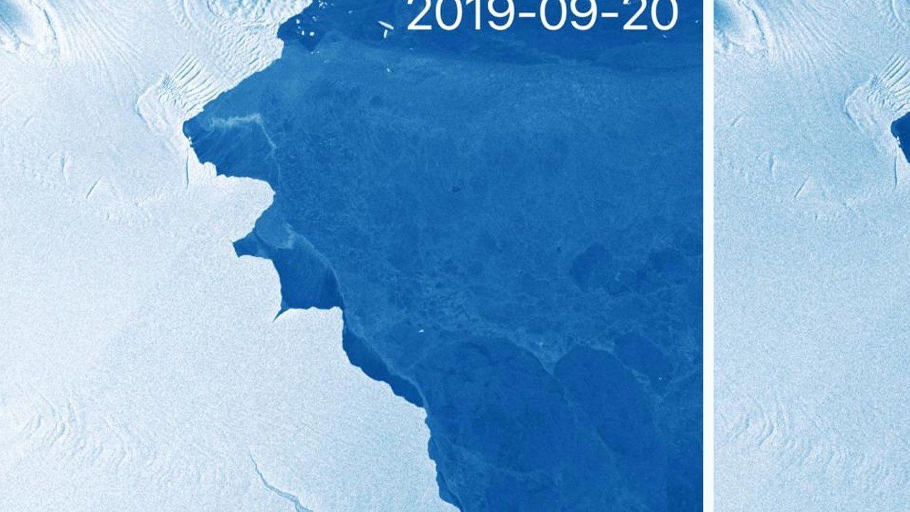 El tuit fue acompañado de dos imágenes capturadas y procesadas por el satélite Sentinel 1: en la primera, del 20 septiembre, se aprecia una grieta en Amery, mientras que en la segunda, obtenida cinco días después, el iceberg está completamente separado de la plataforma de hielo.