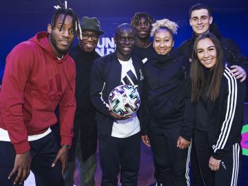 Michy Batshuayi, Ian Wright, N'Golo Kante, Moise Kean, Lauren James, Kepa Arrizabalaga y Katie Zelem presentaron el balón con el que se disputará la Euro 2020. Crédito: Dominic Marley | Getty Images