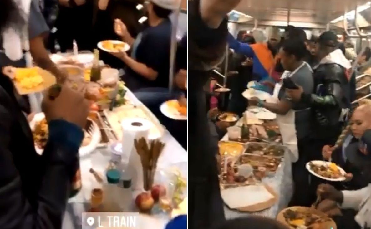 Algunos usuarios de la Línea L del Subway de Nueva York sorprendieron a pasajeros al organizar una cena de Día de Acción de Gracias en uno de los vagones.