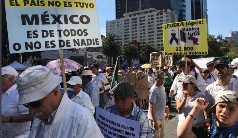 A su paso, los manifestantes ensayan distintas consignas como “México sí, AMLO no”, “seguridad, productividad, México”, “Fuera AMLO”, “Fuera Evo” y “Ni chairos ni fifís, no dividas al país”, entre otras.