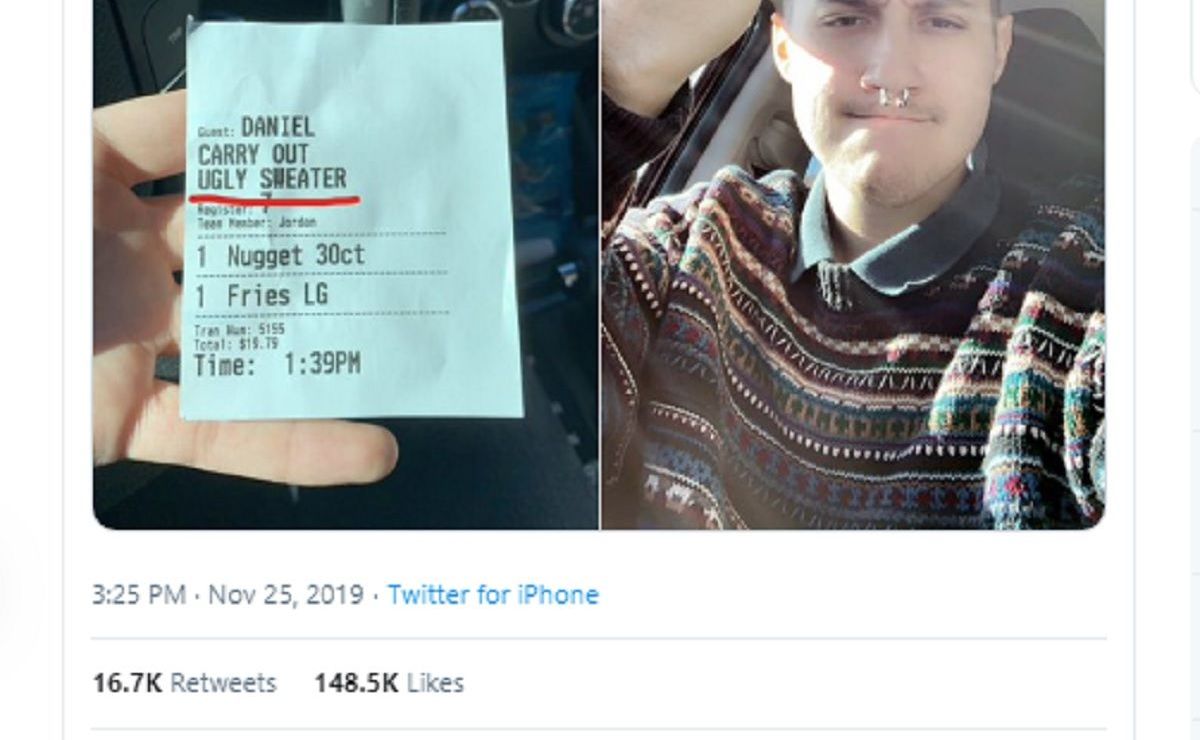 Daniel Graham, un músico que toca bajo el nombre de Zinfandel Zaddy, contó su experiencia en twitter “Hoy no fue un placer comer en Chick-fil-A”, y adjuntó una foto del ticket en el cual se le identificó con la descripción de “suéter feo”.