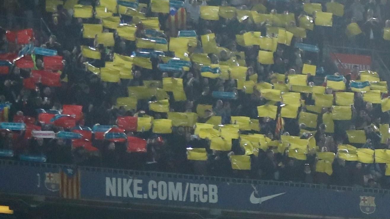 Justo antes de que empezara el clásico español y, después de que sonara por megafonía el himno del Barça y luciera el mosaico habitual, una gran cantidad de aficionados desplegaron otro, con cartulinas azules del tamaño de una bufanda, mientras gritaban ‘Spain sit and talk’ (España, siéntate y habla), justo en el arranque de partido.
