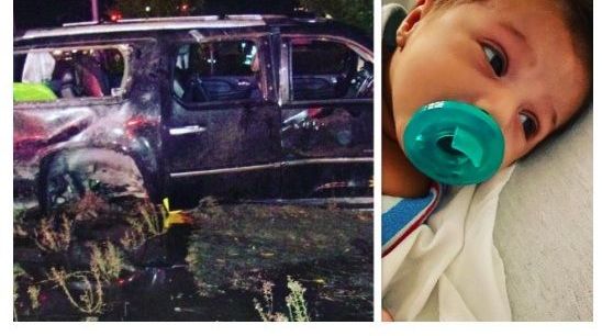 El padre hispano está contando cada una de sus bendiciones, después de que su hijo de 2 años fue expulsado del SUV de la familia, en el accidente. Milagrosamente, el bebé fue encontrado al costado de la carretera, en la cima de un arbusto, en gran medida ileso y aún atado a su asiento infantil.